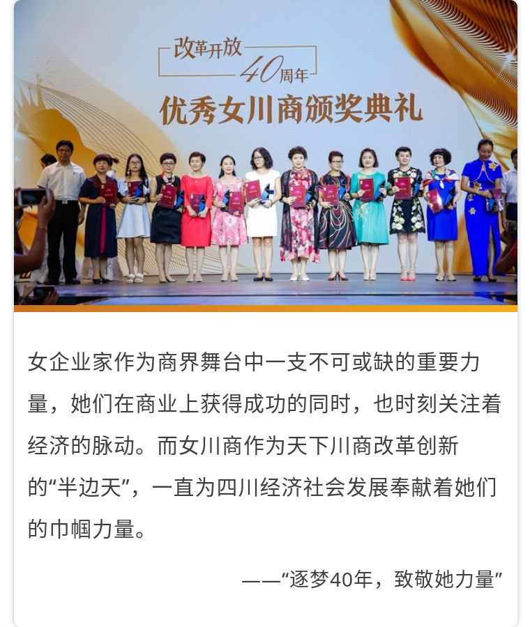 盛典同期發(fā)布了“改革開放40周年優(yōu)秀女川商”獲獎名單并舉行了頒獎典禮,集團副總裁范力女士及其他24位女川商榮獲“改革開放40周年優(yōu)秀女川商”獎項。